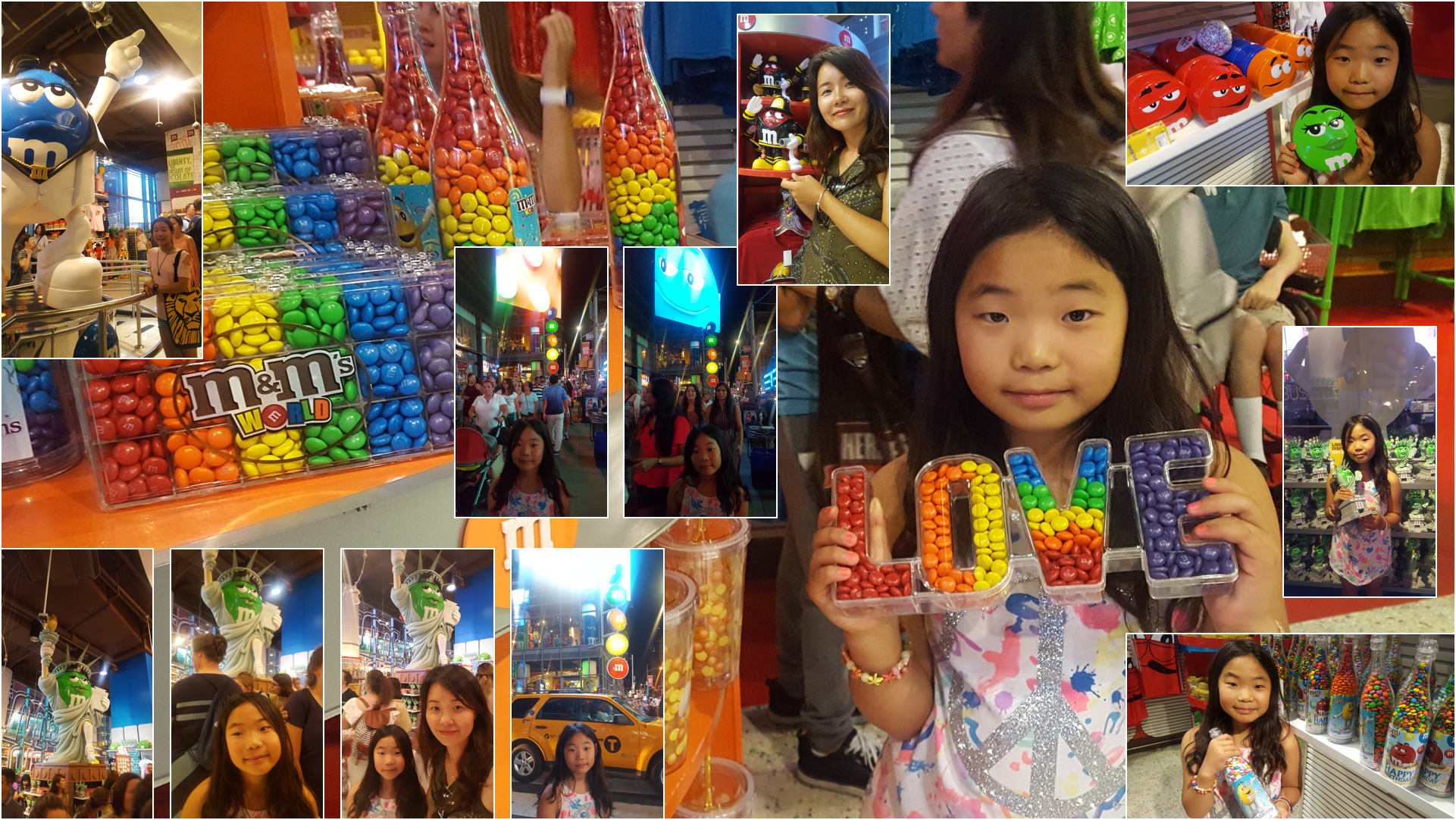 타임스퀘어 바로 옆에 있는 M&M 초코릿 가게에 들렸다. 정말 '빨주노초파남보' 무지개 색깔별로 초코릿이 진열되어 있었다. 내가 봐도 꼭 사고 싶을 정도로 색깔이나 포장이 세련되어 보였다. 작은 아이는 뜬꿈없이 M&M 캐릭터가 있는 초록색 털신을 사달라고 졸라댔다. 사줬다. 기념 자석도 사고 초코릿도 몇개 샀다. 숙소에서 먹어야쥐!!!